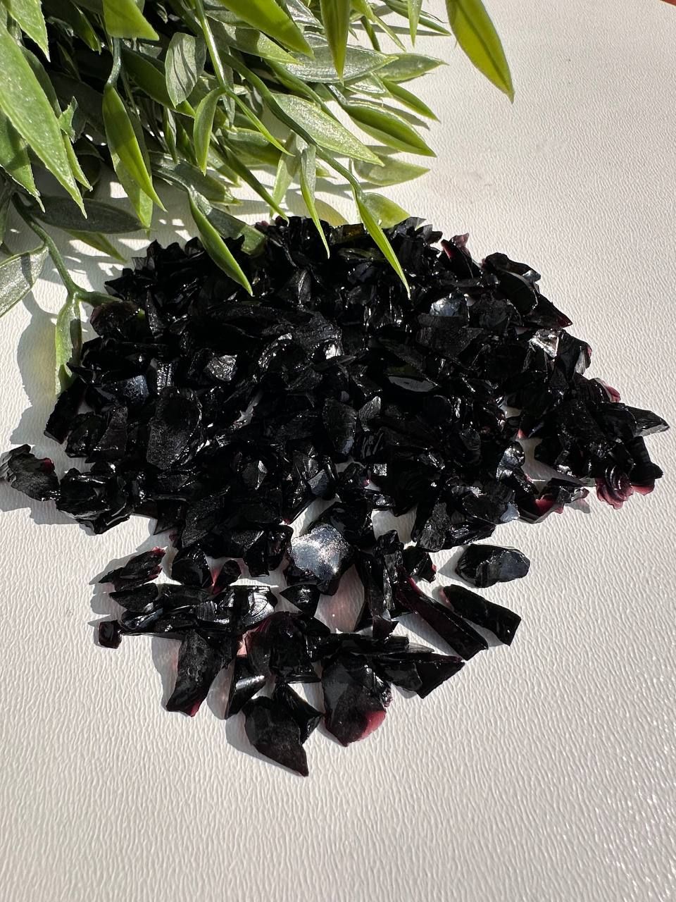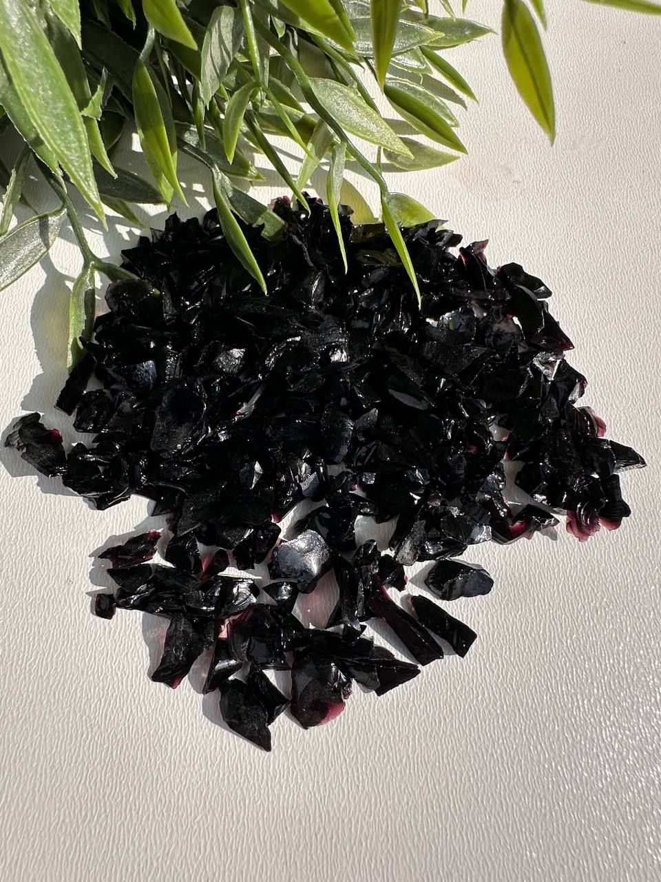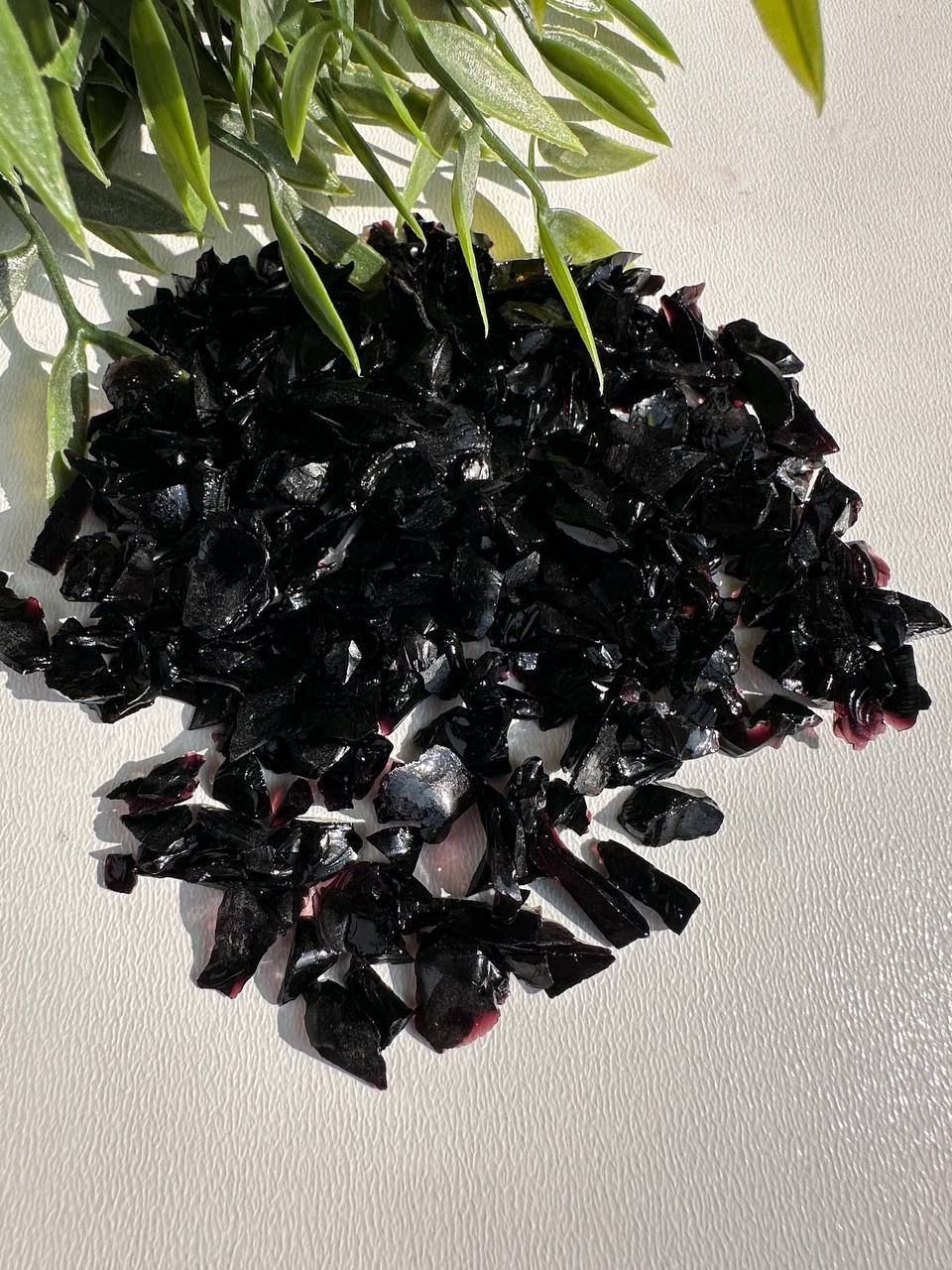 Скляна крихта “Бургундія” 3–5 мм — це декоративний матеріал глибокого темного відтінку, що поєднує майже чорний колір із насиченим бордово-червоним переливом. Завдяки ефекту світловідбиття крихта створює благородний, “дорогий” вигляд і додає виробам глибини та виразності.