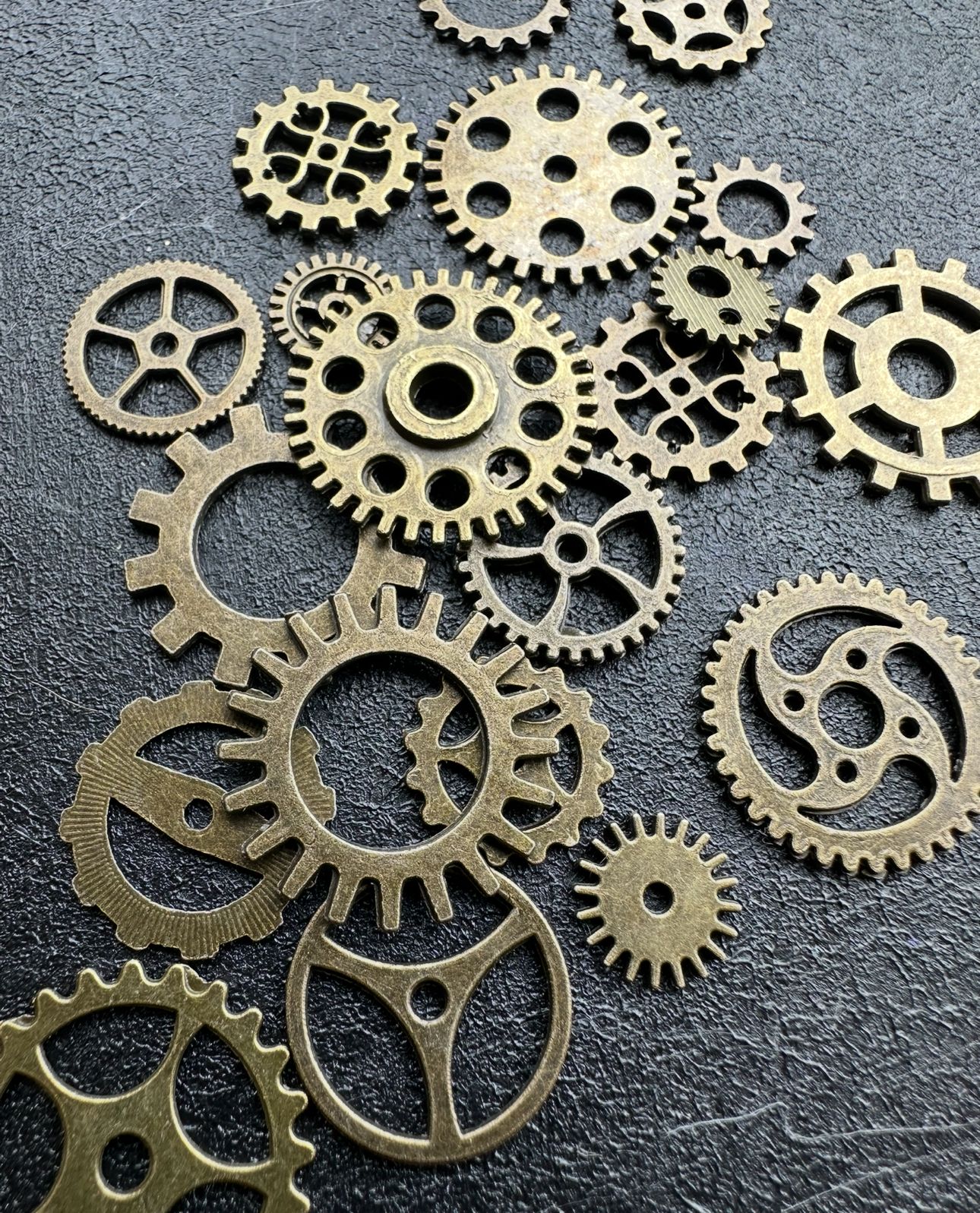 Набір металевих декоративних шестерень у теплому латунному відтінку — ідеальне рішення для створення стильних, деталізованих виробів. Вінтажний металевий блиск додає роботам глибини, характеру та ефекту ретро-індустріального стилю.